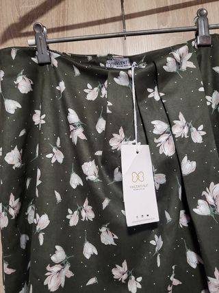 Falda asimetrica ,color verde con estampado de flores ,tela tacto aterciopelado. Medidas :largo de 65 cm ,cintura de 42 cm ,talla XL ,de la marca Valentina .Está nueva con etiqueta !