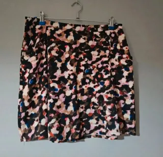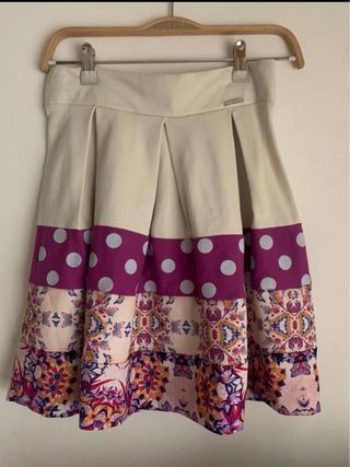 Preciosa falda corta de tablas con una bonita combinación de colores con una sección inferior de estampado floral. - Tiene una cintura elástica en la parte posterior - La falda está compuesta por tres secciones de diferentes estampados. - Ideal para primavera/verano. Nueva con etiquetas Ancho de cintura 70 cm Largo 48 cm