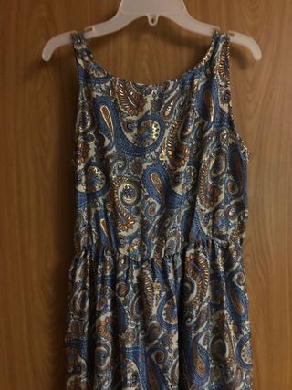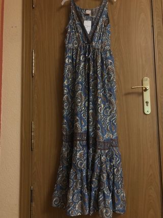 Precioso vestido largo con estampado paisley en tonos azules y dorados. Ideal para cualquier ocasión. - Escote en V. - Tirantes finos. - Cintura elástica. - Falda con vuelo.