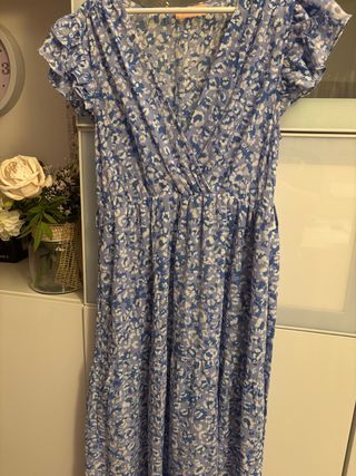 Vestido largo con estampado floral de TFP by Tamara Falcó para Pedro del Hierro. Diseño elegante y femenino. -Vestido confeccionado en georgette de estampado floral. - Cierre de botón en la espalda y cremallera. - Escote en V con manga corta con vuelo y detalle de tablas en hombro. - Cuenta con un nudo en la parte delantera del vestido que acompaña a una falda recta con abertura frontal. - Un imprescindible en tu armario. - Muy elegante. Diseño de Tamara Falcó para Pedro del Hierro. Precio original 289E