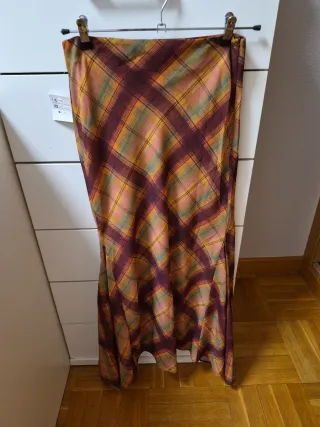Falda larga con estampado de cuadros en tonos granates. - Diseño fluido. - Largo midi.