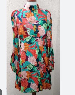 Vestido corto estampado de flores. Manga larga y abullonada en los puños. Cuello perkins y cierre con cremallera trasera. Parte superior ajustada y con un bonito corte bajo el pecho. Falda con vuelo. Nuevo con etiqueta. Forro completo.