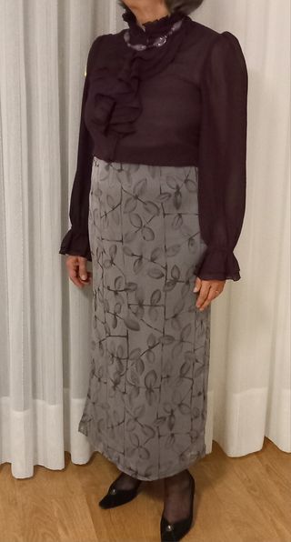 Con fino estampado en color berenjena, abertura lateral de 30 cm.y forrada. Se ha usado solo dos veces. Talla 40/42. Cintura: 81cm. Cadera 102cm. Largo 86cm. En outfit con blusa de gasa, ver foto y armario.