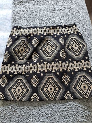 Falda estampada corta de polyiester de Mango con cremallera a un lado..Usada en buen estado. Mide 40 cm de cintura y 45 cm de largo