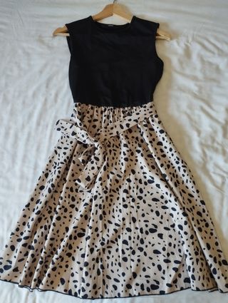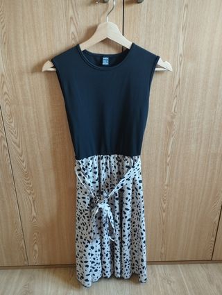 Vestido efecto dos piezas con falda de estampado. Con cinta en la cintura para lazo. Ideal para verano. Talla S, de unos 92 cm de largo.