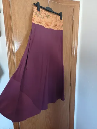 Falda larga con un diseño hippie y bohemio. La parte superior presenta un estampado bordado en tonos anaranjados y detalles florales, mientras que la parte inferior es de un color berenjena intenso. - Largo hasta los tobillos. - Estampado bordado en la zona de la cintura.