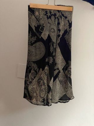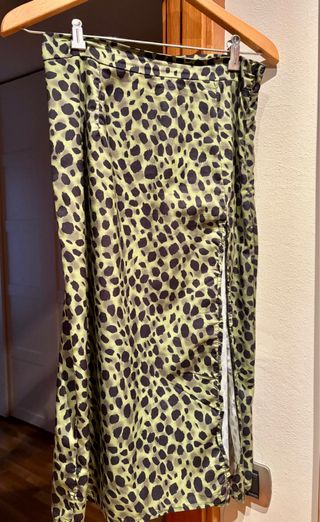 Falda larga satinada con un bonito estampado. - Tejido satinado. - Diseño de animal print en tonos beige y azul. -Goma en cintura 30 cm -Largo 80 cm -Usada una vez