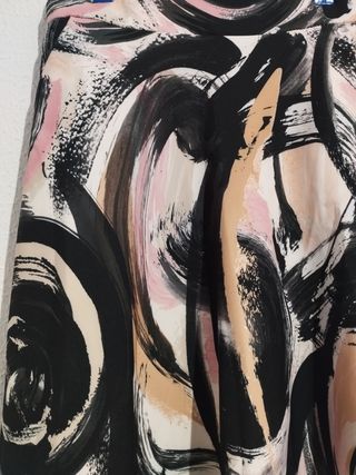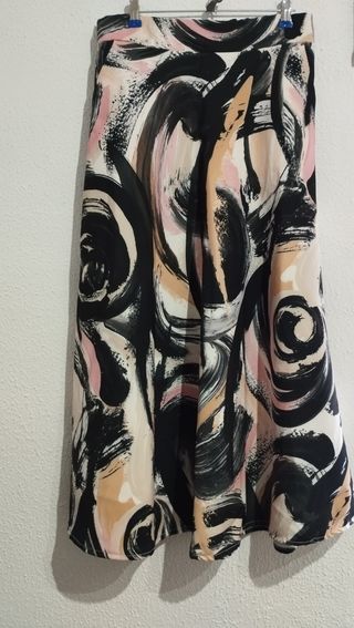 Preciosa falda midi con un estampado abstracto en tonos negros, rosas y beige. Es una prenda elegante y versátil, ideal para cualquier ocasión. Talla única 40/42. Medida Cintura 45 cmts. Largo 85 cmts. - Diseño midi, favorecedor y cómodo. - Estampado único y original. - Tejido fluido y ligero.