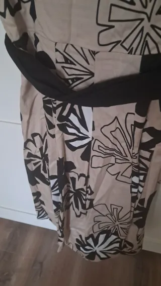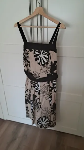 Vestido de raso con un llamativo estampado floral en tonos rosas, negros y blancos. Presenta tirantes y un cinturón a juego con hebilla circular. Este vestido aunque ponga talla 44, no sé corresponde con las tallas actuales. Está arreglado pete fue para una boda y yo llevo una 95C de pecho. Mide 40 de sisa y 40 de cintura y 100cm dec largo. - Tejido satinado. - Falda con vuelo. - Detalle de tul en el bajo.