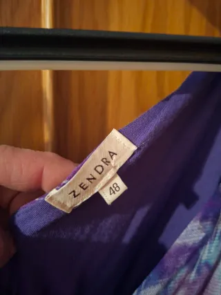 Vestido estampado de gasa en tonos azul y marrón. Muy fresquito. Completamente forrado. Cinturón a juego de raso en color marrón para hacer lazada. Escote barco no muy ancho. Sin mangas. Tanto el escote del cuello como el de las mangas tienen un remate en la misma tela, que aporta un poco de volumen y queda muy bonito. Cuerpo entallado y falda con ligero vuelo Cremallera invisible en espalda. La etiqueta pone talla 42 pero sería más bien una 40. Largo por la rodilla, o justo por encima, dependiendo de tu altura. Marca Festa. Largo total 93 cm. Largo desde la cintura: 53 cm. Nuevo sin etiqueta