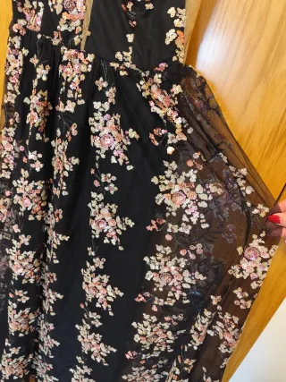 Elegante vestido largo, ideal para eventos especiales. Su diseño presenta un delicado estampado floral. - Escote pronunciado en V. - Tirantes finos. - Falda larga con vuelo. Yo mido 1,64 tengo una talla M y queda perfecto y hasta los pies