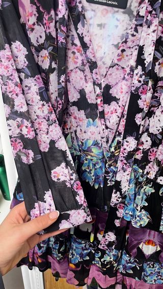Vestido de Zara con un diseño elegante y llamativo. - Mangas largas estampadas. - Cuerpo superior de terciopelo negro. - Estampado floral multicolor en la falda. - Detalle de volantes en el bajo.