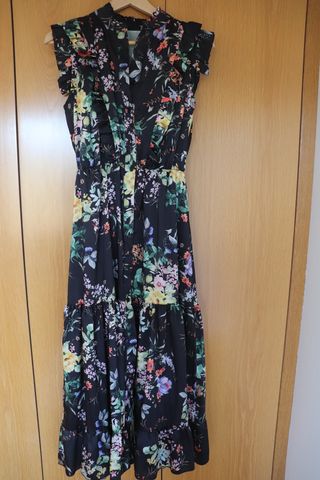 Vestido largo negro estampado de flores de la marca Laura Jimenez. Vestido camisero con botones a lo largo de todo el vestido. Tipo blusa en pecho y falda con vuelo, cintura con goma. Tela satinada. Lleva volantes pequeños en el pecho y espalda. Usado para un evento, lo vendo porque me ha quedado pequeño. Talla L, da poca talla.