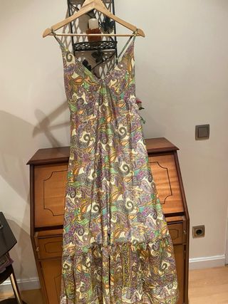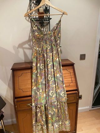 Vestido de Zara con un bonito estampado paisley en tonos marrones y multicolor. Ideal para un look bohemio y chic. - Diseño con escote en V. - Mangas largas acampanadas. - Varios volantes en la falda. - Detalle de pedrería en el escote.