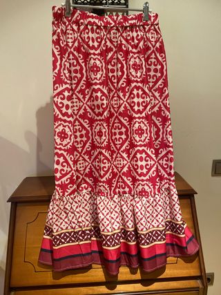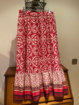 Falda larga con estampado geométrico de Pull & Bear. - Diseño con cintura elástica. - Estampado multicolor con tonos rojos y marrones. - Largo midi. - Sin etiquetas, pero no la he usado jamás. -100% poliéster