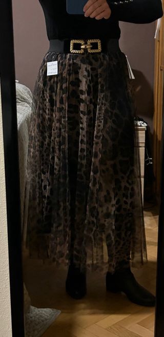 Falda larga de tul con un llamativo estampado animal print. - Diseño fluido y elegante. - Cintura elástica para mayor comodidad, 32 cm sin estirar - Forro elástico - Sin estrenar, con etiqueta de compra. Precio de compra 38,99€