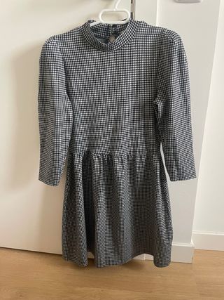 Vestido con un clásico estampado de pata de gallo. - Manga larga. - Cuello alto. - Cintura fruncida. - Falda con vuelo.