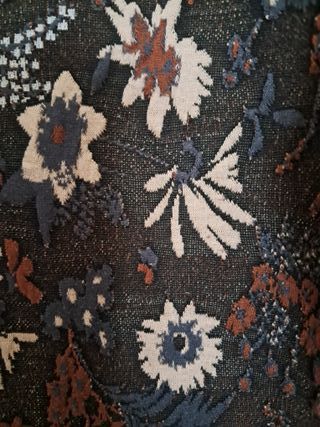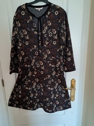 Vestido corto de punto con un bonito estampado floral en relieve en tonos oscuros. Manga larga, cortado por la cintura y falda evasé. Escote con abertura en pico. Mide 86 cm. de cintura pero como es de punto se puede adaptar, tambien queda muy bonito con cinturón. Largo total 93 cm. Composición: 83% polyester, 16% viscosa y 1% elastano. Es de la marca Clockhouse que pertenece a C&A. - Manga larga. - Estampado multicolor sobre fondo negro.