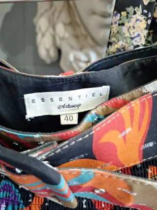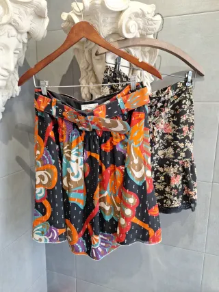 Conjunto de dos minifaldas con estampados llamativos. - La de Essentiel es T.40 y presenta un diseño abstracto multicolor con cinturón y pequeños detalles brillantes. Mide 52cm de largo. - La de Naf- Naf es T. 42 y tiene un estampado floral tipo Liberty sobre fondo negro. El bajo tene un delicado encaje con doble volante. Mide 48cm de largo. Las dos estan forradas totalmente.
