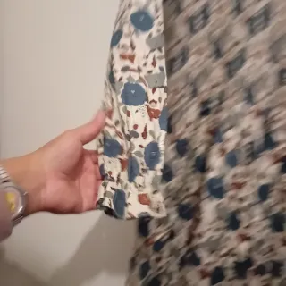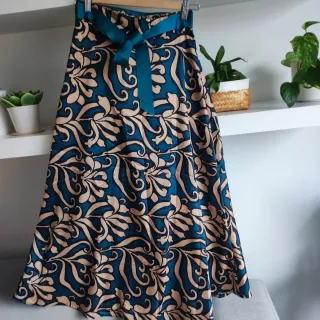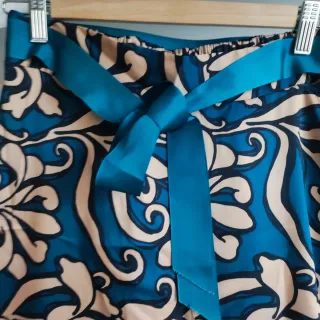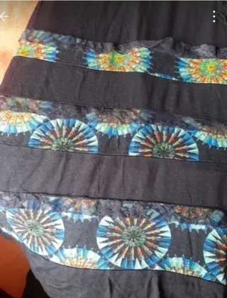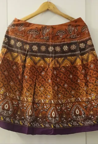 Falda TALLA 44, con un estampado llamativo. Cremallera, quillas, FORRO poliamida. Exterior poliester, viscosa y elastano. Lavable y muy combinable. Cintura 37x2, largo 81, ancho abajo 1.08x2 SOLO EFECTIVO