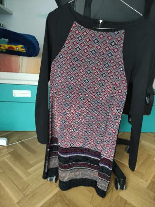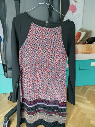 Vestido de la marca Desigual con un diseño llamativo. - Mangas largas con detalles estampados. - Varios paneles con estampado geométrico en la falda. - Corte recto y cómodo.