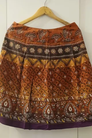 Falda larga y fluida, con un diseño vibrante y original. - Hecha en la India. - Estampado con motivos paisley y detalles geométricos. - Cintura ajustable con cintas para anudar.