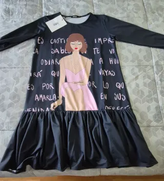 Vestido de manga larga con un diseño llamativo y falda con volantes. - Estampado frontal con ilustración y texto. - Falda con volante en el bajo. -Detalles de brillantes en el collar,pulsera y logotipo cuello.