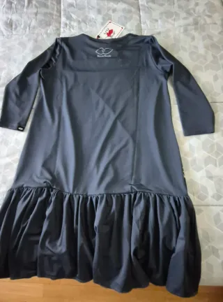 Vestido negro con estampado floral y manga larga abullonada, tiene dos costuras y una de ellas se frunce todo a lo largo. Cuello cerrado y cremallera invisible en la espalda. La falda consta de tres volantes. Mide 53 cm de axila a axila, 45 de cintura y 90 de largo. Talla 42-44. Muy poco uso.