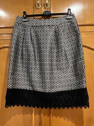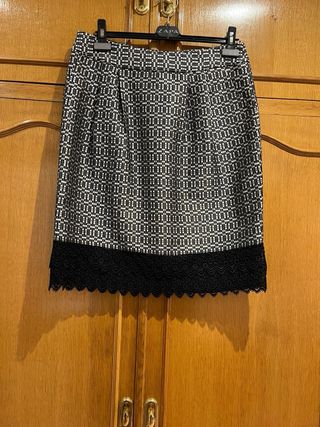 Falda elegante con estampado geométrico y detalle de encaje. - Diseño de corte A. - dos pinzas delanteras y - - -bolsillos laterales - Bajo con banda de encaje negro. - Largo hasta la rodilla - la tela es tipo lurex, - la falda es de vestir, fiesta, eventos