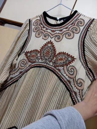 Vestido de estilo boho con estampado geométrico en tonos rosa, azul y amarillo sobre fondo negro. Corte favorecedor con cintura marcada, botones frontales y falda con volante en el bajo. Manga larga con acabado elástico. Talla M. De una tienda local de Madrid (marca Teria Yabar). Tela ligera y cómoda, ideal para entretiempo o primavera. En muy buen estado, apenas usado