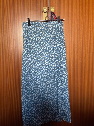 Falda larga con estampado floral. - Diseño con flores blancas sobre fondo azul. - Corte fluido y elegante. - 166 cm de alto