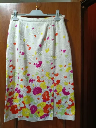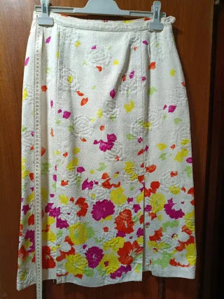 Falda midi con un vibrante estampado floral. - Diseño con flores en tonos fucsia, naranja, amarillo y verde. - Tejido texturizado con relieve. - Abertura delantera. - Está hecha a mano (mi abuela era costura) así que no tiene marca, ni etiqueta. Es única y exclusiva. Ya no me vale, por eso la vendo. - Mide 38 cm de cintura y 73 cm de largo como se puede ver en las fotos