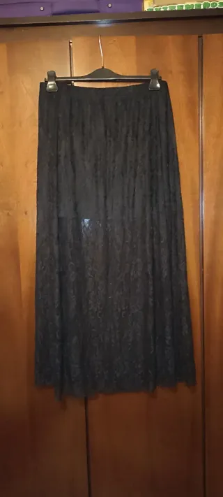 Preciosa falda larga de encaje con un encaje de buena calidad. Tejido de encaje con estampado floral. La cintura es muy elástica para mayor comodidad y da para varias tallas. Largo hasta los tobillos pero depende de tu altura claro. Falda interior más corta en color negro también. Está NUEVA sin usar. Más ropa, calzado, complementos y mucho más en mi perfil. Poco a poco iré subiendo muchas cosas más. Échale un vistazo y sígueme para enterarte de las novedades!!!! Cualquier cosa preguntame por mensaje privado sin compromiso!!