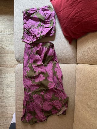 Conjunto de dos piezas con un llamativo estampado floral. - Top tipo strapless con volantes. - Falda larga con estampado. - Tejido ligero y fluido.