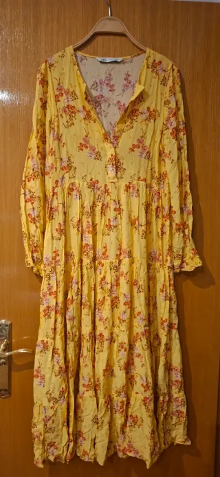 Vestido largo con estampado floral de Zara. - Diseño con cuello redondo. - Manga larga. - Cintura marcada y falda con vuelo.