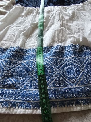 Vestido de tirantes con un diseño veraniego y fresco. He añadido fotos con medidas de largo y debajo del pecho La parte superior es de color azul oscuro y la falda es blanca con un bonito estampado en la parte inferior. - Parte superior con detalle de botones. - Falda con bordado decorativo.