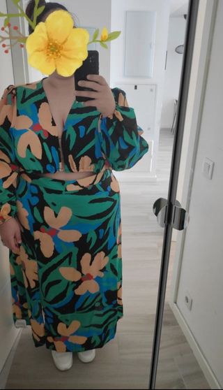 Precioso conjunto de top y falda con estampado floral. Sin estrenar. - Top con escote en V y lazadas. - Falda larga.