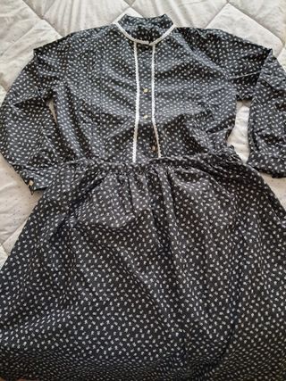 Camisa y falda con estampado de florecitas en blanco y negro. Con dos pañuelos de florecitas. Sin delantal negro - Talla 40-42 (L). - Diseño de dos piezas: falda larga y blusa. - Detalles de encaje blanco en cuello y puños.