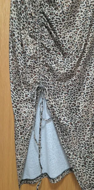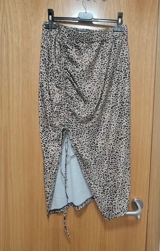 Falda midi con un llamativo estampado de leopardo. Presenta un diseño fruncido con cordón ajustable en el lateral para crear una abertura. - Diseño fruncido con cordón. - Abertura lateral ajustable. - Largo midi. - Talla M/L
