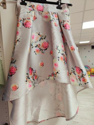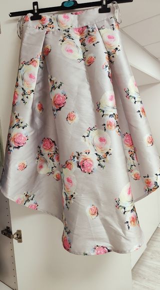 Falda ceremonia, largo asimétrico, más larga por detrás que por delante. Color gris plata estampado con flores. Look ideal para bautizo o comunión. Yo la combiné con un body blanco.