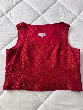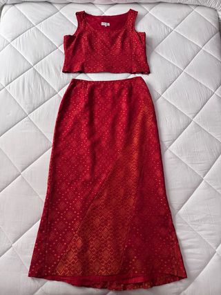Precioso conjunto de dos piezas, compuesto por top y falda vintage de la marca española Ángel Iglesias, equivalente a una talla L actual (talla 44/46 antigua). Hecho en Zamora, España. Es una pieza muy especial, de calidad. Con estampado estilo oriental, damasco, estilo jacquard bordado. Medidas del top: 50 cm de axila a axila y 44 cm de largo. Medidas de la falda: 40 cm de cintura, 53 cm de cadera y 93 cm de largo. Ideal para estas navidades y para ocasiones especiales.