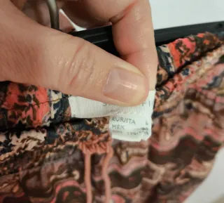Falda larga con un bonito estampado floral en tonos beige, morado y blanco. - Cintura elástica y cinturón negro de tela, opcional para mudo, lazo,.. - Tejido ligero y fluido. La talla va bien para M. Puesto en una ocasión.