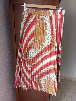 Falda larga con un bonito estampado y plisado. - Diseño con cadenas y motivos barrocos. - Cintura elástica para mayor comodidad. - Largo midi.
