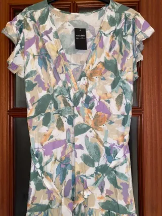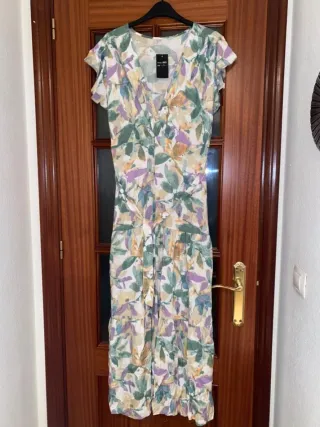 Vestido midi con un estampado llamativo. - Diseño con cuello redondo y manga larga. - Corte fluido con falda en capas. - Detalle de abertura en el escote. Abertura discreta en escote delantero trasero. Elástico en cintura y cierre en espalda con botón. No se ha usado y conservo las etiquetas porque pensaba que me lo iba a poner pero no, y ya no pude devolverlo.