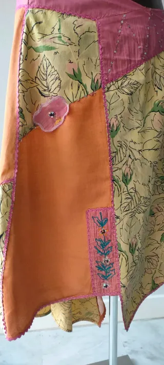 Falda de verano con un diseño único y colorido. Perfecta para combinar con camisetas de distintos colores - Tejido ligero con estampado de flores y hojas. - Detalles de pedrería y bordados. - Combinación de paneles en tonos rosa y naranja. - Largo delantero por la rodilla y trasero más largo.