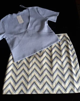 Conjunto de falda y top con estampado. La falda mide de cintura 39 cm. Y de largo 42 cm NO ENVIO. PRECIO NO NEGOCIABLE. ENTREGA PASEO MARIA AGUSTIN 60. - Top de canalé con escote pronunciado. - Falda con estampado de zigzag en tonos beige y azul