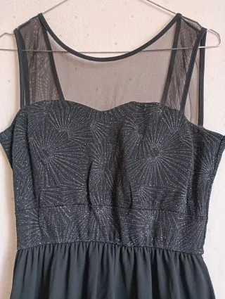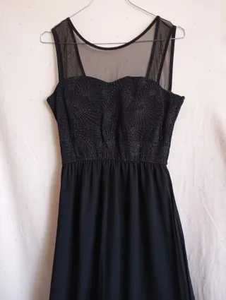 Elegante vestido largo con detalles brillantes. - Escote ilusión con tejido de malla. - Cuerpo superior con estampado geométrico y brillo. - Falda larga y fluida.