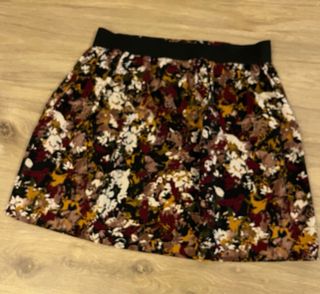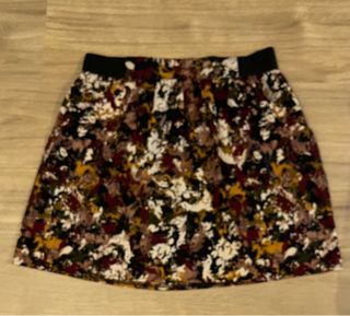 Falda de mujer con un bonito estampado floral. - Diseño con flores en tonos rojizos y detalles en marrón. - Largo hasta la rodilla. - Cintura elástica en la parte de adelante.