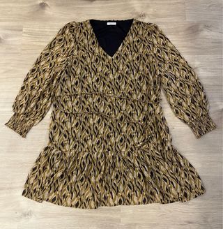 Vestido de Zara con un llamativo estampado de leopardo en blanco y negro. Presenta un diseño con cuello en V y mangas largas. - Cintura elástica para un ajuste cómodo. - Falda con volantes en capas. - Tejido ligero y fluido.