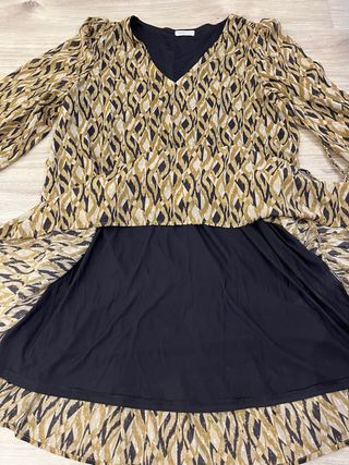 Falda mid con estampado animal print en tonos beige y marrón. - Cintura elástica. - Forro hasta la rodilla y el resto semitransparente. - Tejido ligero y fluido. - 92 cm. de largo - Muy poco uso, prácticamente nueva.